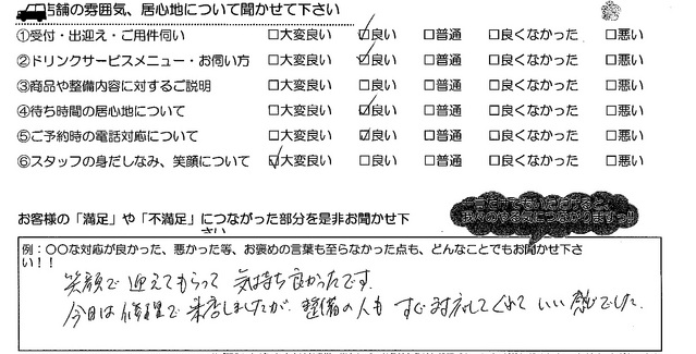 笑顔で迎えてもらって気持ち良かったです。 今日は修理で来店しましたが、整備の人もすぐ対応してくれていい感じでした。