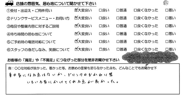 車の気になる点はないか、ドリンクのおかわり等 いろいろ気にかけてくれる点が良かった。