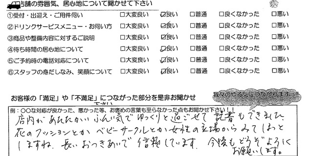 店内があたたかいふんい気でゆっくりと過ごせて読書もできました。花のファッションとかベビーサークルとか女性の立場からみてほっとしますね。長いおつきあいで信頼しています。今後もどうぞよろしくお願いします。