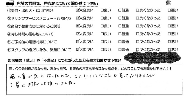 風の音が気になったので、このダイハツさんで買っておりませんが、丁寧に対応して頂けました。