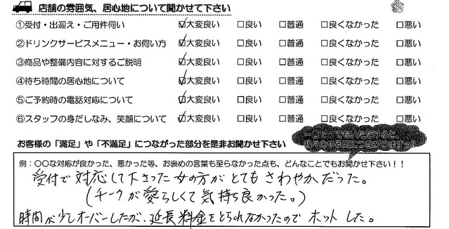 受付で対応して下さった女の方がとてもさわやかだった。 (チークが愛らしくて気持ち良かった。) 時間が少しオーバーしたが、延長料金をとられなかったので、ホッとした。