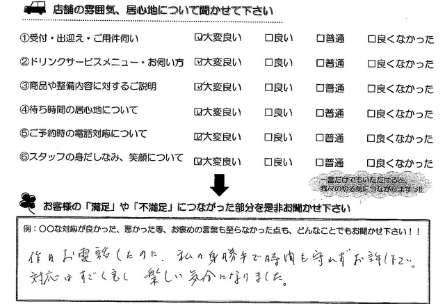 昨日お電話したのに、私の身勝手で時間も守れずにお許し下さい。対応はすごく良く楽しい気分になりました。