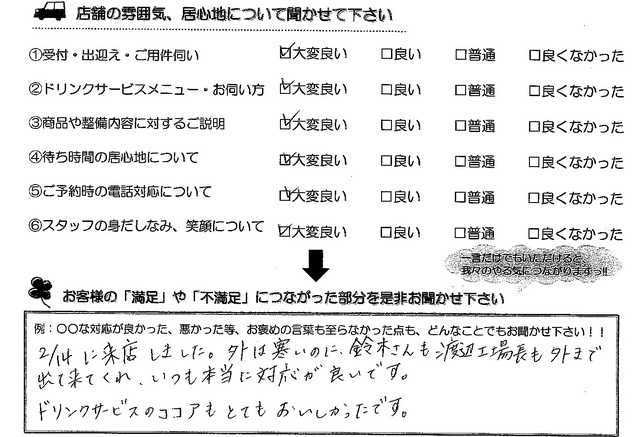 2/14に来店しました。外は寒いのに、鈴木さんも渡辺工場長も外まで出て来てくれ、いつも本当に対応が良いです。 ドリンクサービスのココアもとてもおいしかったです。