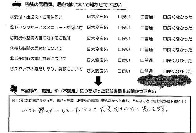 (車検で来店)お車の中に何も残っていませんか、かぎはホルダーが多いものでしたので、大事な他のかぎはございませんか と聞いてくれて助かりました。