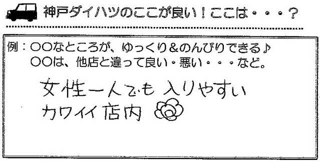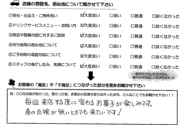 毎回来店する度に変わるお菓子が楽しみです。 車の点検が無いときでも来たいです!
