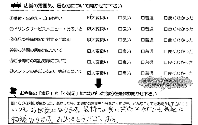 いつもお世話になります。気持ちの良い対応で何でも気軽に相談できます。ありがとうございます。