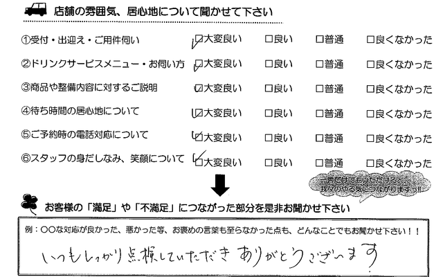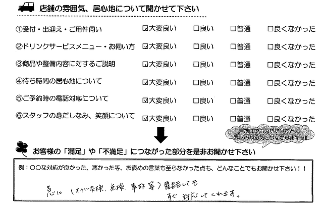 急に(オイル交換、点検、事故等)電話してもすぐ対応してくれます。
