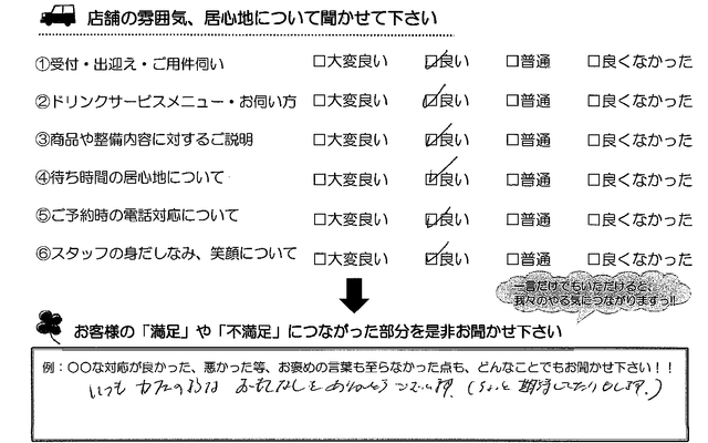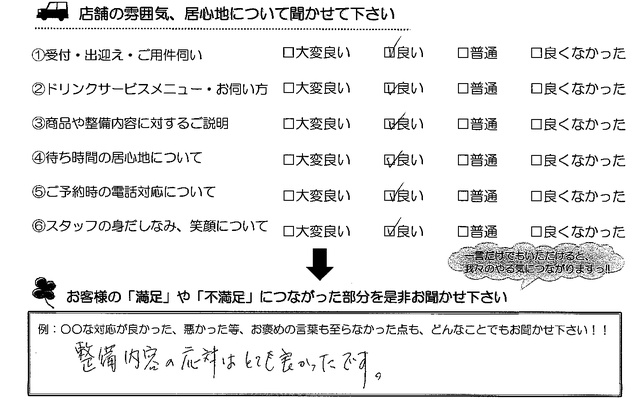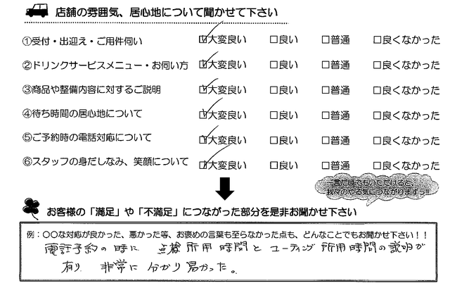 電話予約の時に、点検所要時間とコーティング所要時間の説明が有り、非常に分かり易かった。
