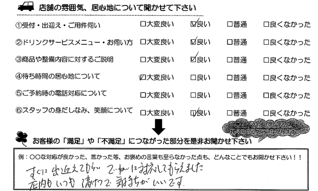 すぐに出迎えてもらい、ていねいに対応してもらえました。 店内もいつも清けつで気持ちがいいです。