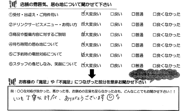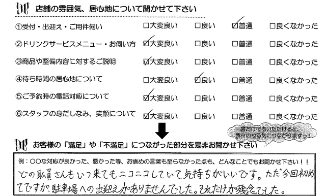 どの職員さんもいつ来てもニコニコしていて気持ちがいいです。ただ今回初めてですが、駐車場への出迎えがありませんでした。それだけが残念でした。