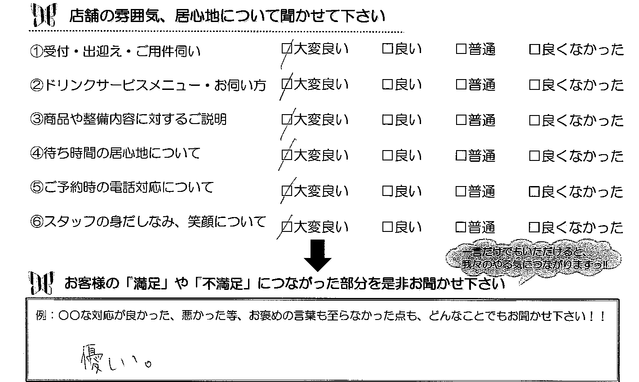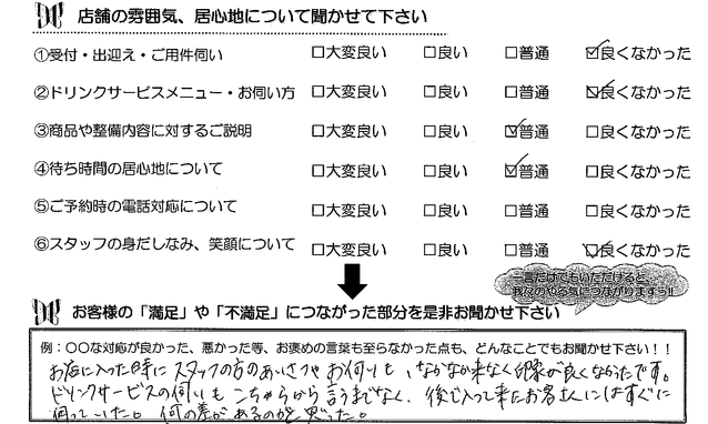 お店に入った時にスタッフの方のあいさつやお伺いも、なかなか来なく印象が良くなかったです。ドリンクサービスの伺いもこちらから言うまでなく、後で入って来たお客さんにはすぐに伺っていた。何の差があるのかと思った。