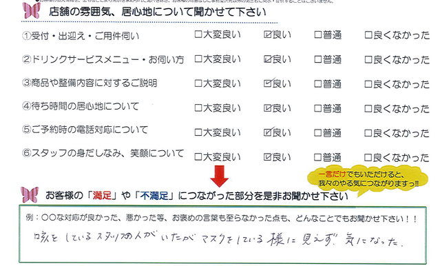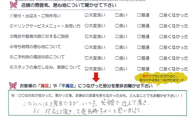こちらへは3度目ですが、いつも、笑顔で迎えて頂き、そく対応して頂き、大変気持ちよいと思いました。