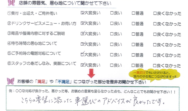 こちらの要望に添った車選びのアドバイスが良かったです。
