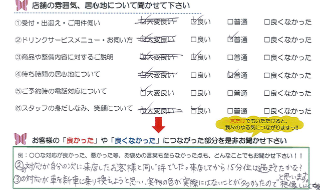 (2)の対応が自分の次に来店したお客様と同じ時でした。来店してから15分くらいはすぎてたかな?と思います。 (3)の対応が車を新車に乗り換えようと思い、実物の色が実際にはないことが多かったので想像しにくかったです。