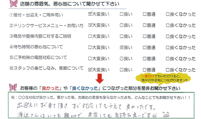 出迎えにすぐ来て頂き、すぐ対応してもらえて良かったです。渡辺さんはいつも親切で、来店しても気持ち良いです♡