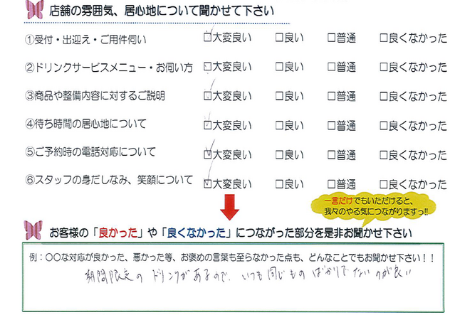 雨が降っていたのですが来店時に傘をさしてくれたのがよかった。担当してくれてる服部さんがあいさつにに来てくれてよかったです!!