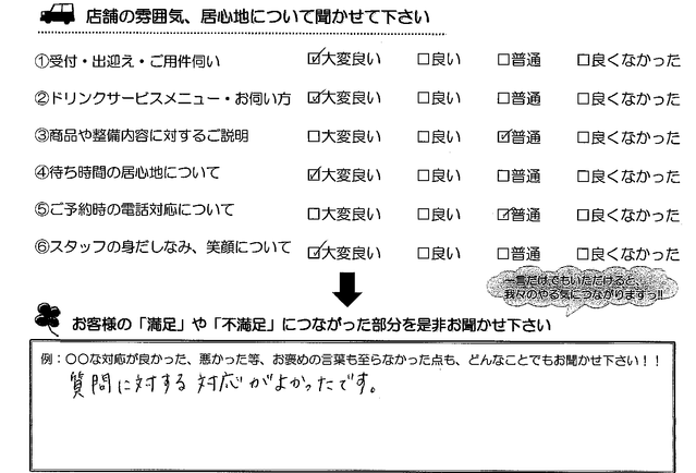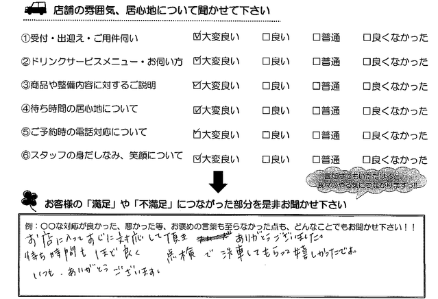 お店に入ってすぐに対応して頂きありがとうございました。 待ち時間もほど良く、点検で洗車してもらって嬉しかったです。 いつも、ありがとうございます。