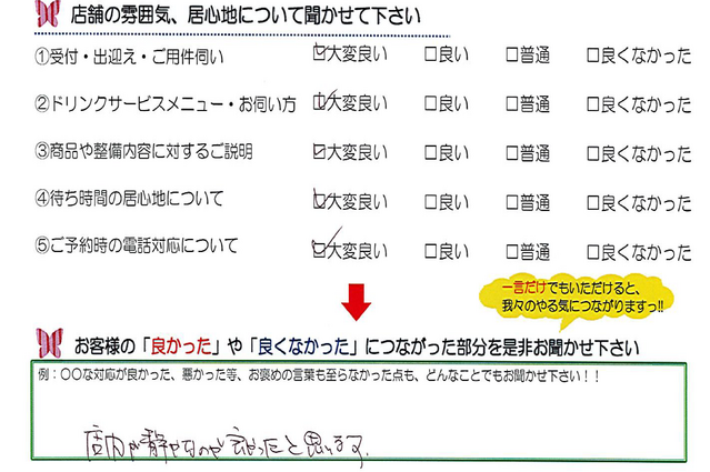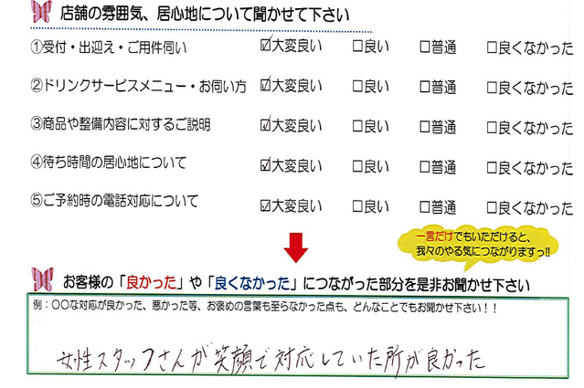 毎月店舗にお越しいただいたお客様よりたくさんのお言葉をいただいております。 ほんの一部ではありますがご紹介いたします。